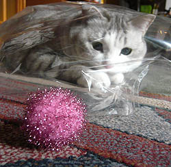 2009年03月30日 箱にも袋にも 新人の箱や袋が登場すると、どうしても一度は入らないといけないらしいこのお方。 そして中で「ふんがふんが」と遊んだら一息。 そこにお気に入りのボールをころり。 すると素早い動きで「おりゃ」「とりゃ」と。 でも届かない。 届かない。 そしてこのお顔。 「なぜなんだ」 「どうしてなんだ」 と考えているのか、 それとも「定額給付金は猫にはないのか」と考えているのか、 それとも眠くなったのか、、 正解は、、そうです、この後すぐお休みになられたのでした。